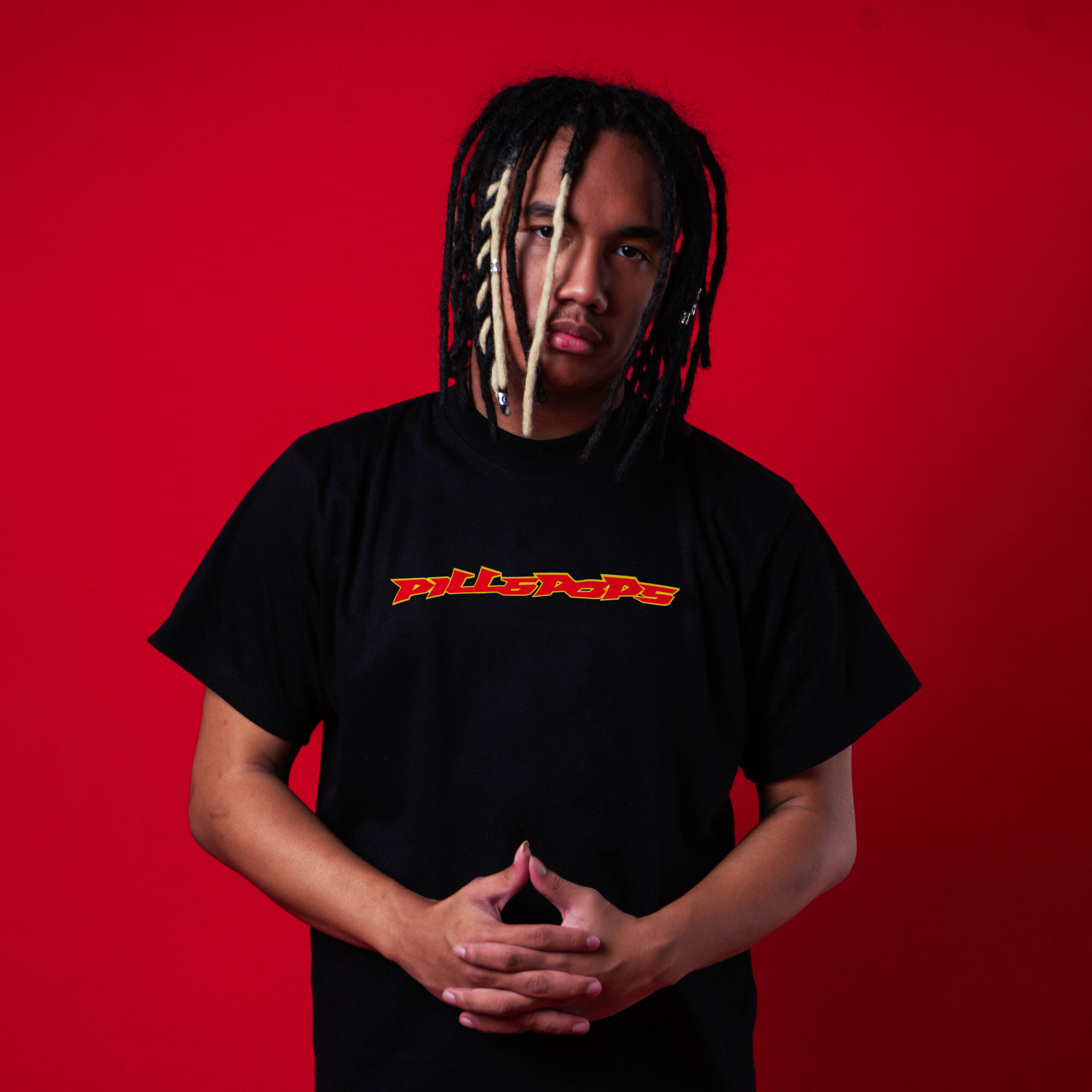 Black streetwear T-shirt with PILLSPOPS logo