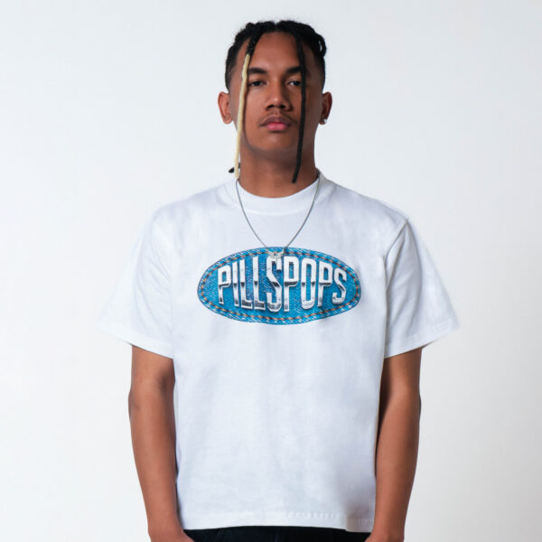 The PILLSPOPS Oval Logo White T-Shirt is made for those who appreciate clean design with a bold edge.